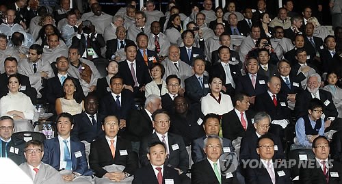 Kook Jin Nim (second row, second from left with sky blue tie) sits in the VIP section of the Yeosu Expo gala opening performance with President Lee Myung Bak (fourth row, center) and other dignitaries.