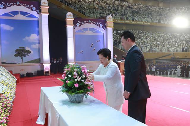 The First Anniversary of the Universal Seonghwa of Sun Myung Moon, the True Parent of Heaven, Earth and Humankind was held in a solemn atmosphere. The ceremony started with the entrance of Dr. Hak Ja Han Moon who offered flowers to Rev. Sun Myung Moon’s photo. Dr. Chang Shik Yang, Vice Chairman of FFWPU-International, served as the emcee and gave the opening remarks.