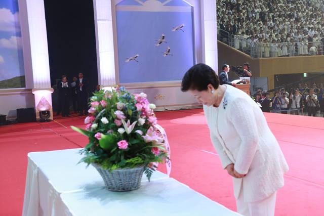 During her speech, Dr. Hak Ja Han Moon emphasized that we have to become one in heart. “I feel my husband, Rev. Dr. Sun Myung Moon, might appear and say ‘How have you been?’ We have realized one heart and one vision. We should praise Rev. Moon’s guidance and establish his vision of peace. Through this Seonghwa ceremony, Korea and Japan have become one. Representatives from Japan and Korea rode bicycles together for 20 days from Japan to the Korean 38th parallel to promote the reunification of South and North Korea. We should keep going forward for the sake of establishing heaven on earth, which embodies freedom, peace and unity worldwide. Rev. Moon is living with us in our heart. Let us establish the vision of heaven and be filial children of heaven.”