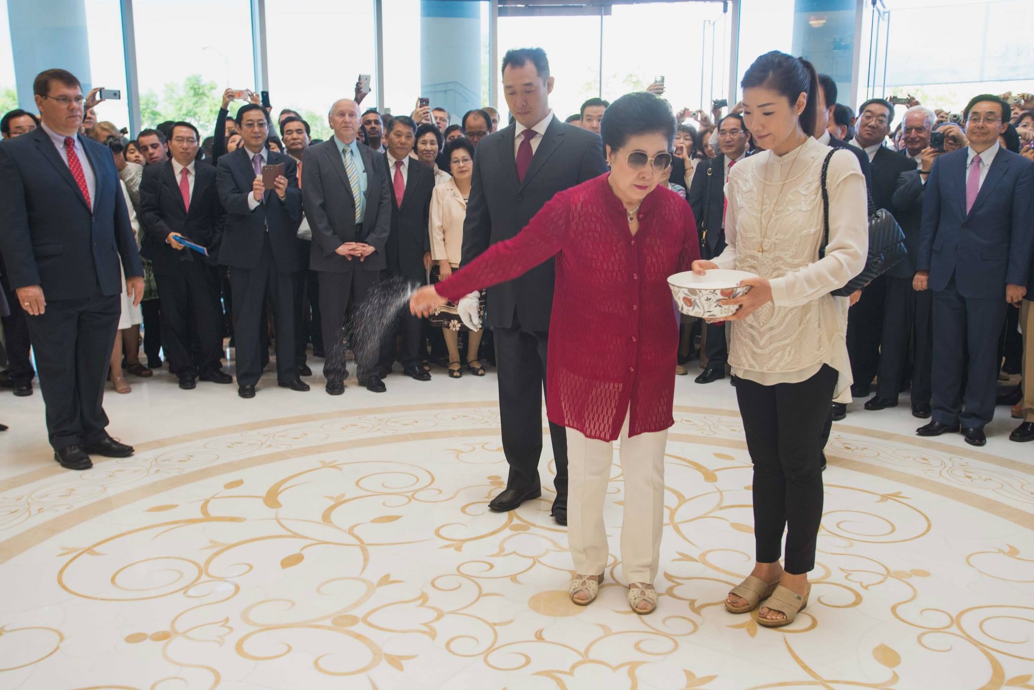 True Mother gave a tearful prayer, asking our Heavenly Parent for forgiveness for not being able to do more and do it faster. Following the prayer, there was a ribbon-cutting, and everyone entered the peace center with True Mother. Her demeanor was of complete seriousness over the occasion.  As she went from room to room to bless the center, the crowd gathered in the main entrance hall to prepare the space for the ceremonial cake cutting and congratulatory song. Congressman Dan Burton and his wife were front and center. Sun Jin Moon, International President of the Family Federation for World Peace and Unification (FFWPU), In Sup Park, FFWPU International Vice President, Kwon Jin Moon and his wife Hwa Yun moon, Prof. Yeon Ah Moon, and her children were all in attendance.