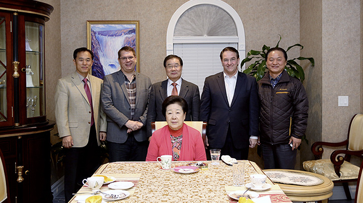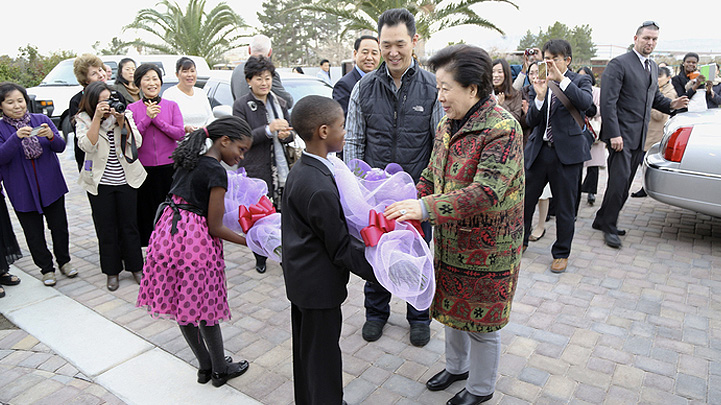 On January 7, 2014, True Mother, Dr. Hak Ja Han Moon, arrived in Las Vegas from Korea at 4pm and received New Year’s greetings from about 70 local church members gathered at the Cheon Hwa Gung residence. Kwon Jin Moon and his wife, Hwa Yeon Chun Moon and Yeon Ah Choi Moon were all on hand for a very enthusiastic welcome. Dr. Ki Hoon Kim, FFPWU North American Continental Director served as emcee.