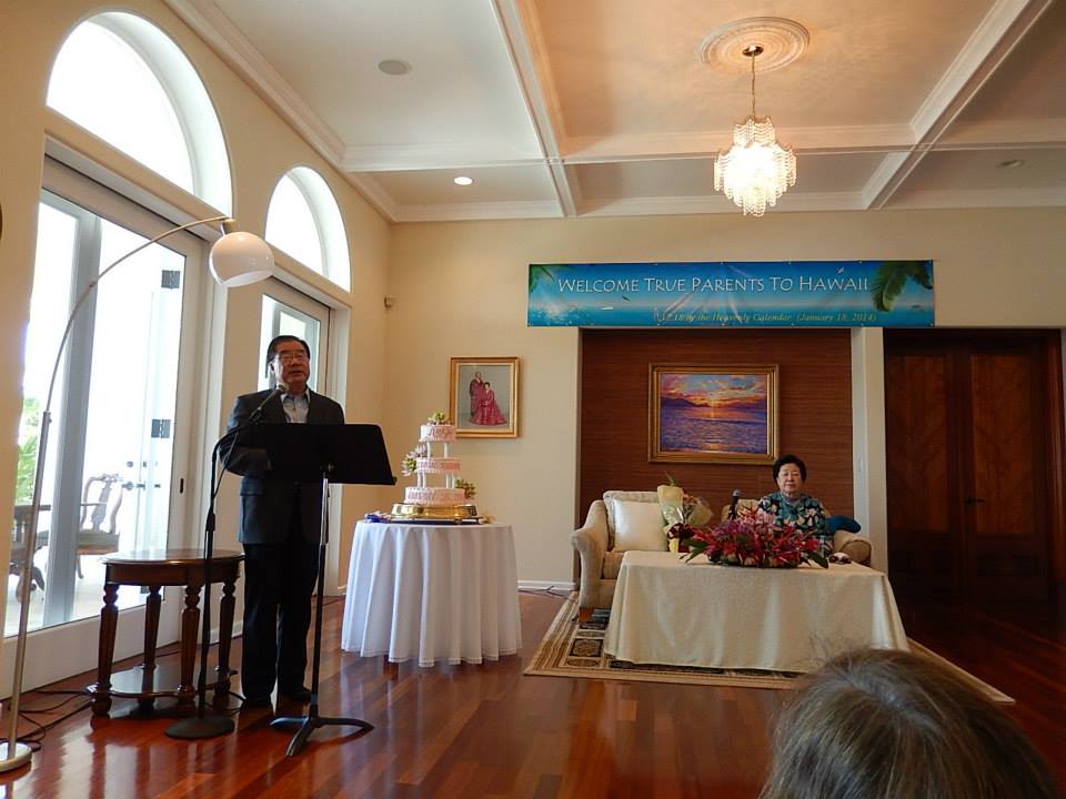 On January, 18, 2014, True Mother was greeted upon her arrival in Hawaii by local members with a greeting of "Aloha" (Welcome) and her response of "Mahalo!" (Thank you). After receiving a presentation of flowers and cutting of the celebration cake, True Mother began to speak.