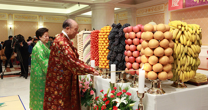 Rev. and Mrs. Sun Myung Moon, the True Parents of humankind, ligth the holy candles for God’s Day, Cheonbokgung, South Korea, 2011.