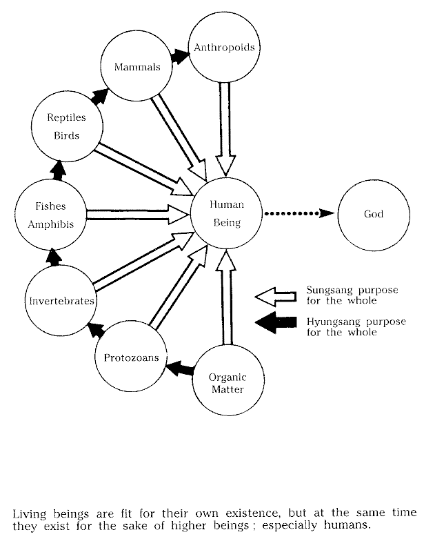 The purpose for the individual refers to seeking one's own existence, multiplication, and maintenance; and the purpose for the whole refers to existing for the beings that are higher than oneself. In other words, the "purpose for the whole" of all things is to exist for the higher living beings, especially the human being. For this reason, all living beings exist as beings with dual purposes, which are the purpose for the individual and the purpose for the whole (see Fig. 14).