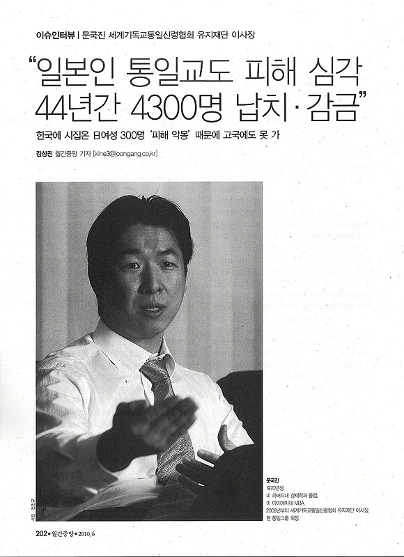 The following interview of Tongil Foundation Chairman Kook Jin Moon appeared in the June 2010 issue of Wolgang JoongAng, one of South Korea's most widely read monthly news magazines.