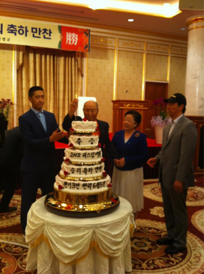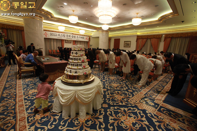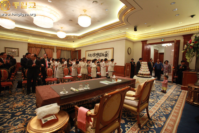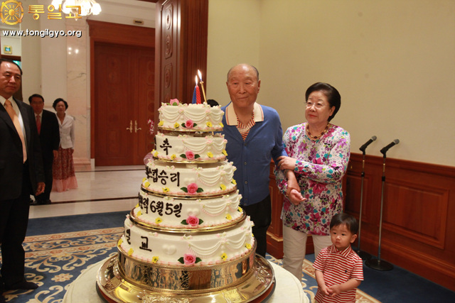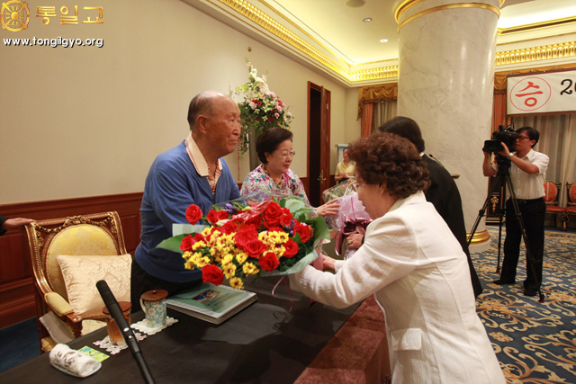 True Parents entering the hoondokhae room True Parents with the Victory Cake Flower presentation by Chief. and Ms. Kyunam Park